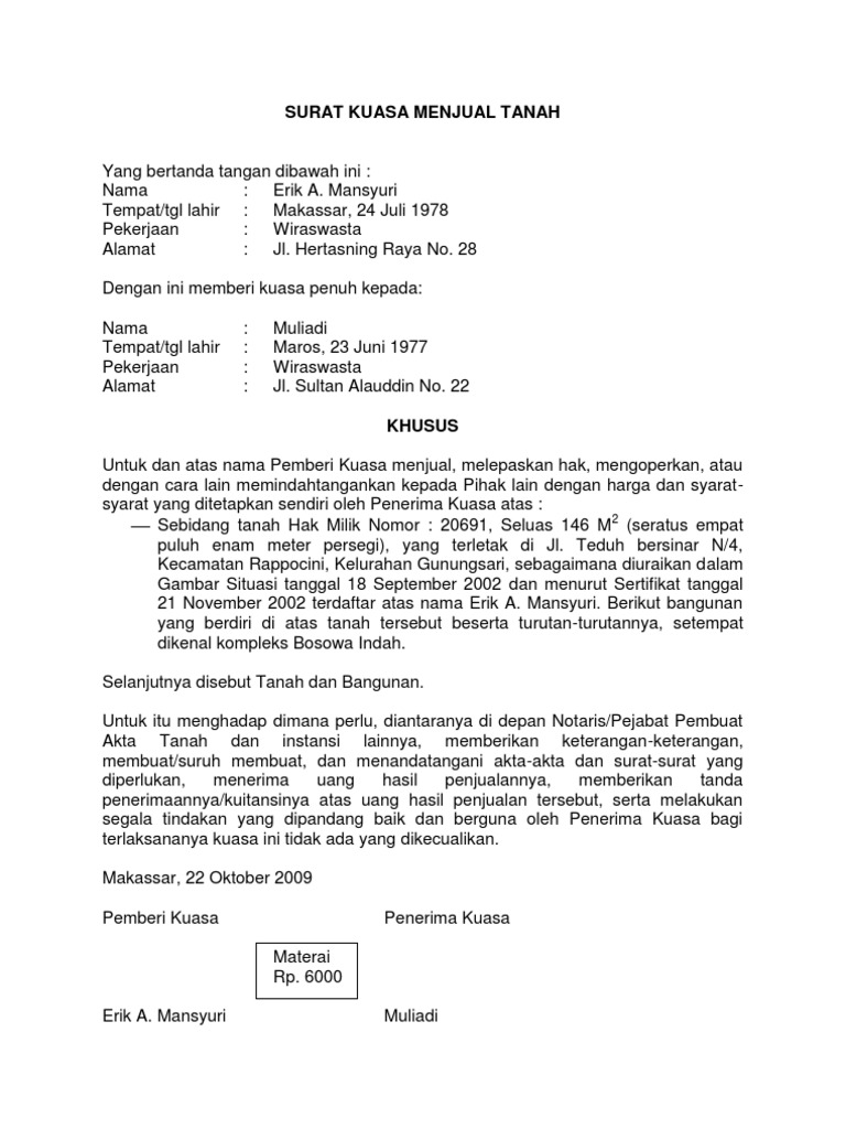 Contoh Surat Kuasa Penjualan Sebidang Tanah Otosection